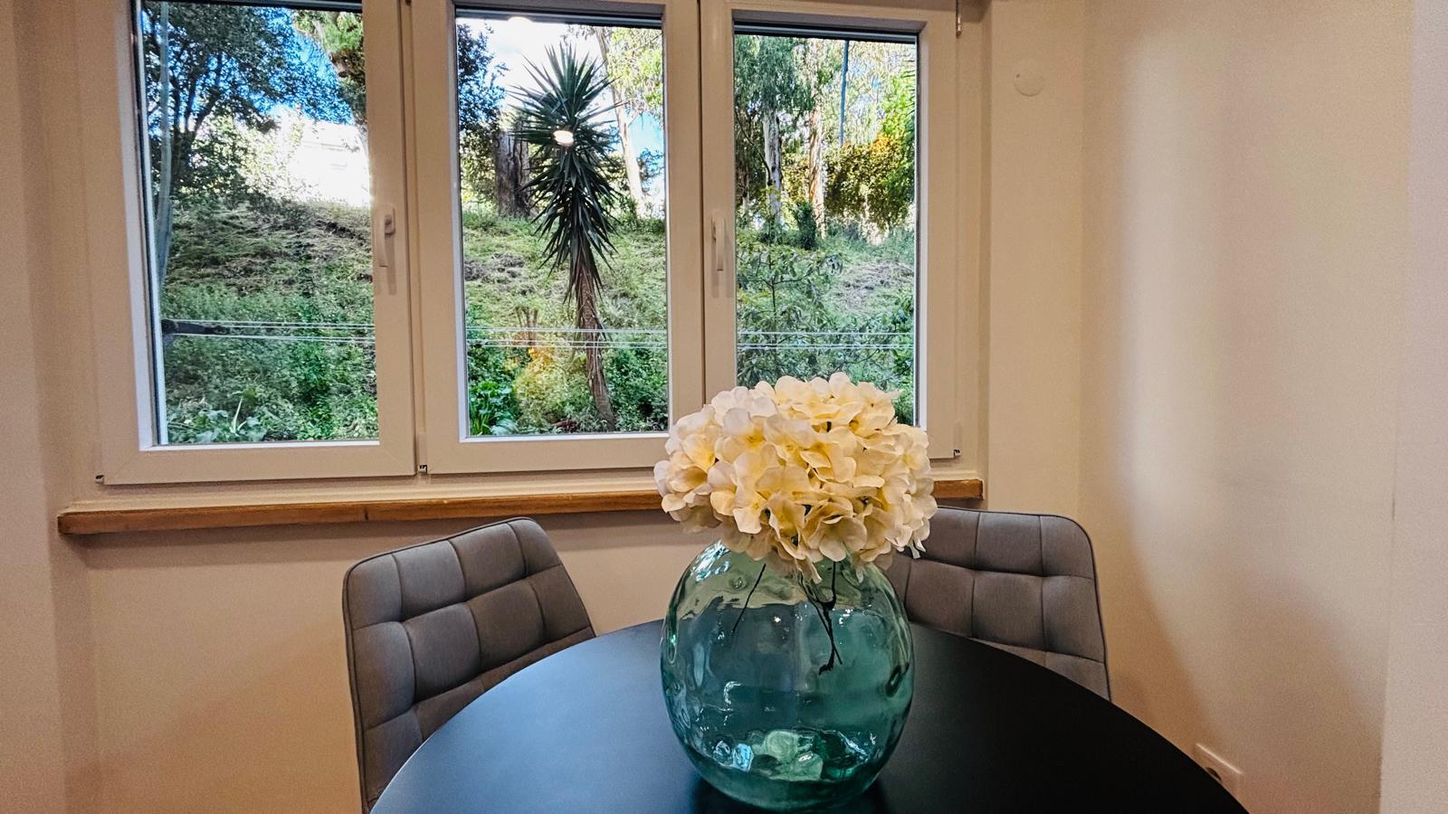 • Caixilharia em PVC lacada a branco, com vidros duplos e sistema oscilo-batente;